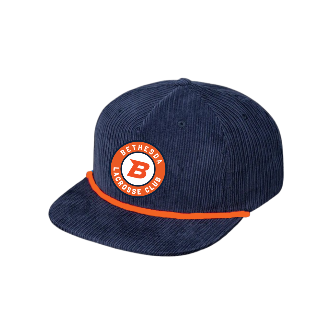 A custom hat created for Bethesda Lacrosse Club and Fans. This hat is cozy and classic, with a custom embroidered circle patch on the front of a soft corduroy navy hat with orange rope and sturdy structure. This hat will be a starter for you any day!