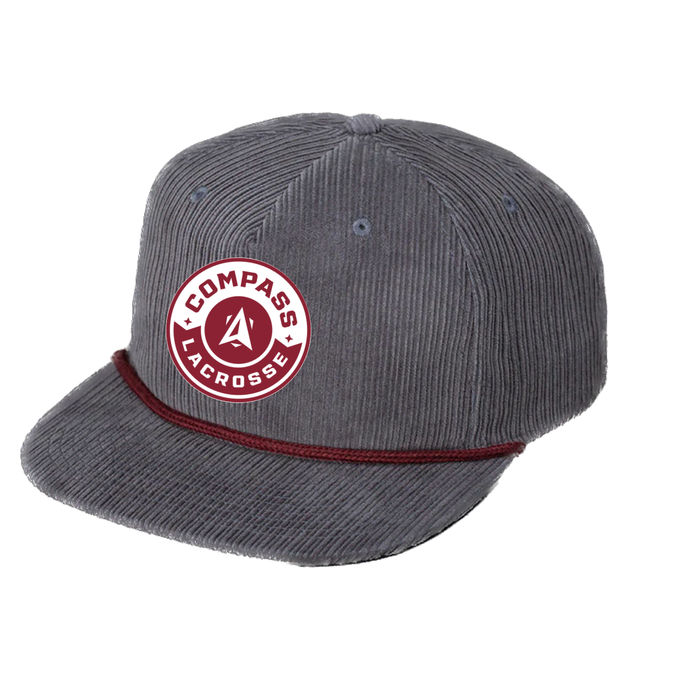A custom hat created in collaboration with Compass Lacrosse. This hat is cozy & classic with big vintage vibes. The Compass Lacrosse two-tone badge is sewn on the front of a charcoal corduroy hat and finished off with a maroon rope.