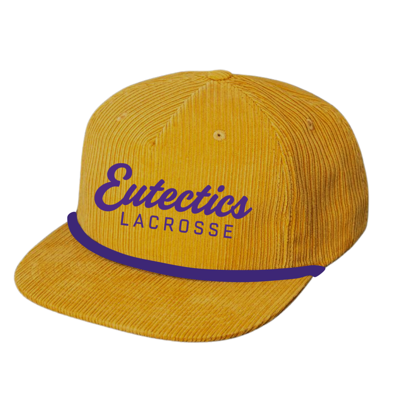 A custom hat created for the Eutectics Lacrosse community. 3D embroidered purple script shines on the front of this old gold hat finished off with a regal purple rope.