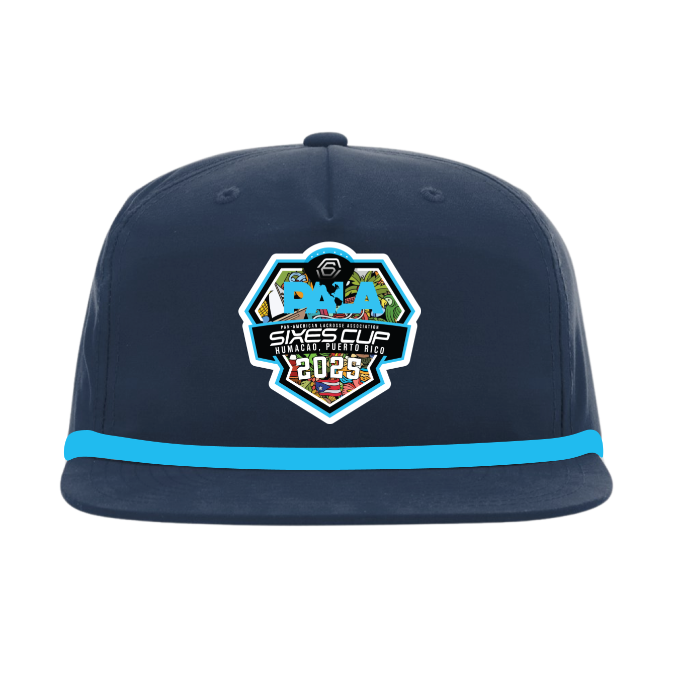 A custom hat created for the 2025 PALA Sixes Cup. This look is all about the vintage vibes; with the PALA 2025 Event patch on soft-structured pinch front hat with a custom rope.