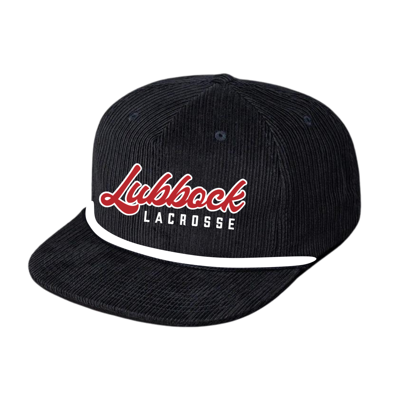 A custom hat created in collaboration with Texas Tech Men’s Club Lacrosse. This hat is a cozy classic made for the hometown faithful -- with Lubbock Lacrosse stitched proudly on the front of a corduroy hat with a white rope lacrosse the brim.