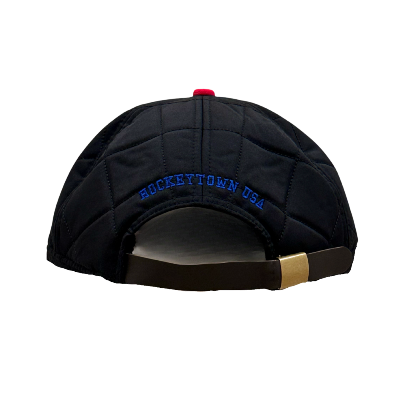 An ultra custom design created for Warroad. The custom red rope across the brim, and the blue ropes on the earflaps celebrate the Warroad Lakers' and Warroad Youth Hockey's olympian colorways. Finished off with "HOCKEYTOWN, USA" stitched on the back.